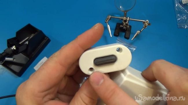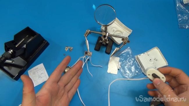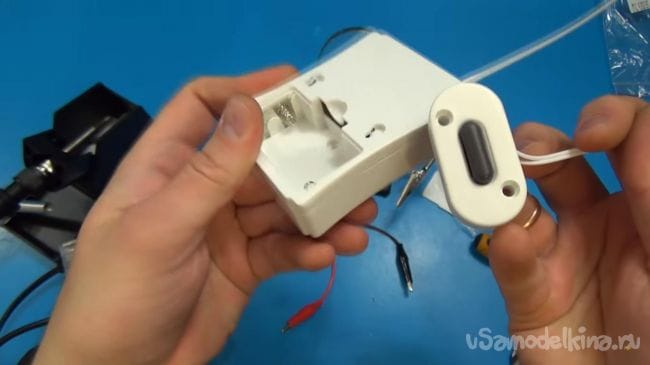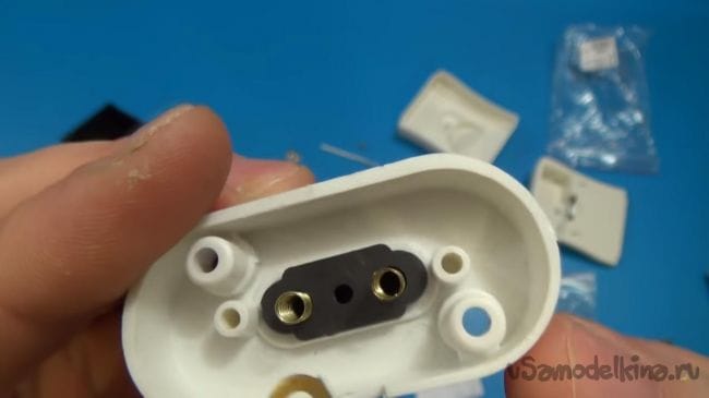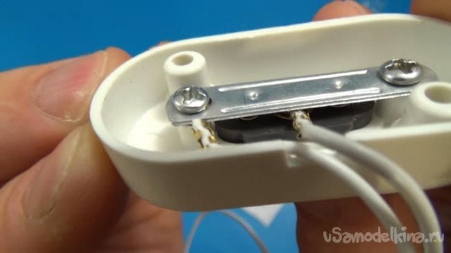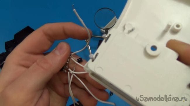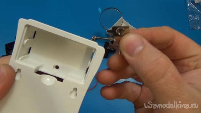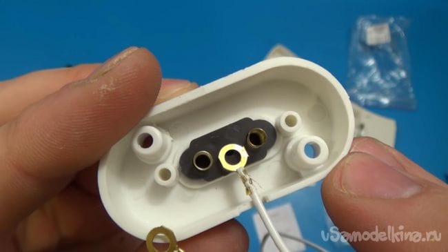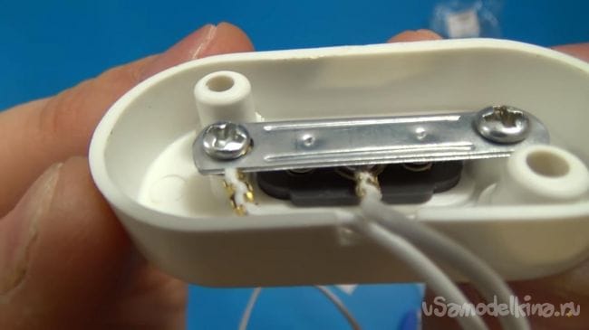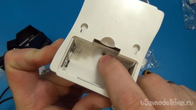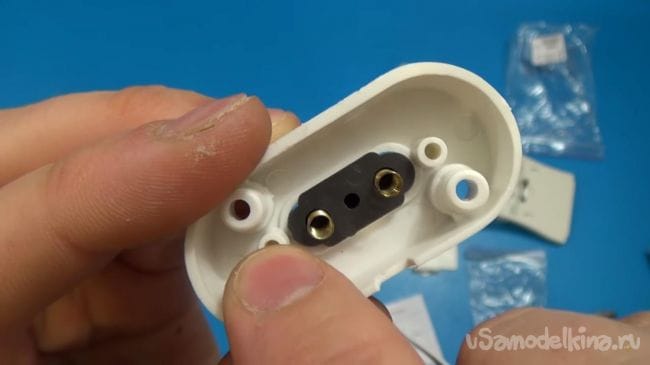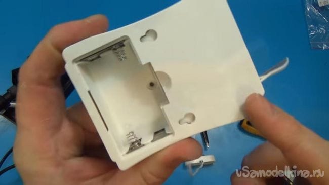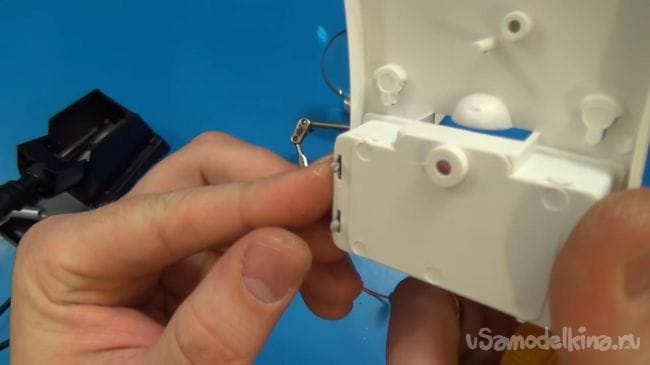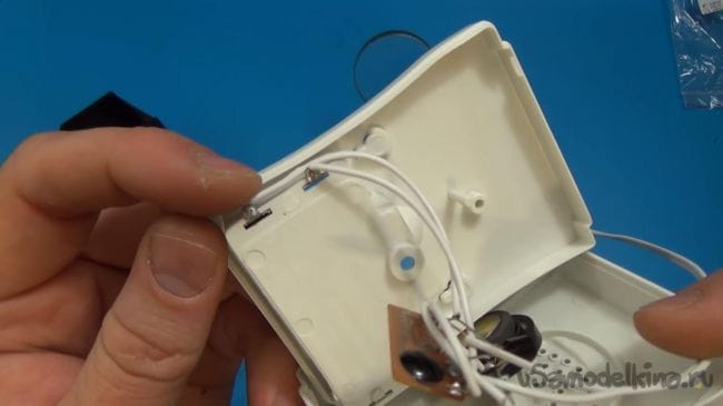 Для батареек устанавливаем контакты в отдельный отсек для этого и загибаем у них край, делается это для того, чтобы при вытаскивании батареек контакты оставались в корпусе, после чего к ним припаиваем провода питания.