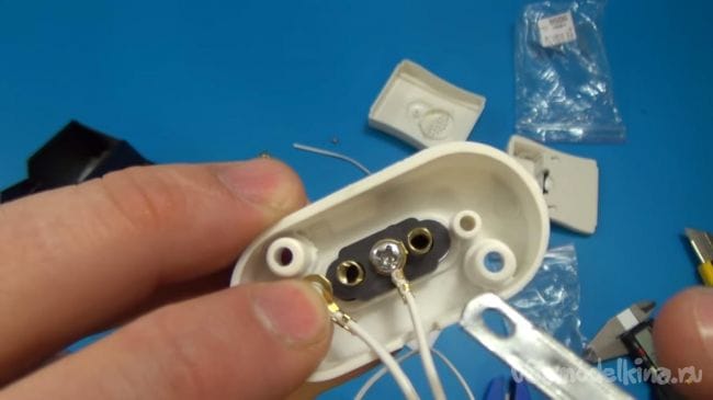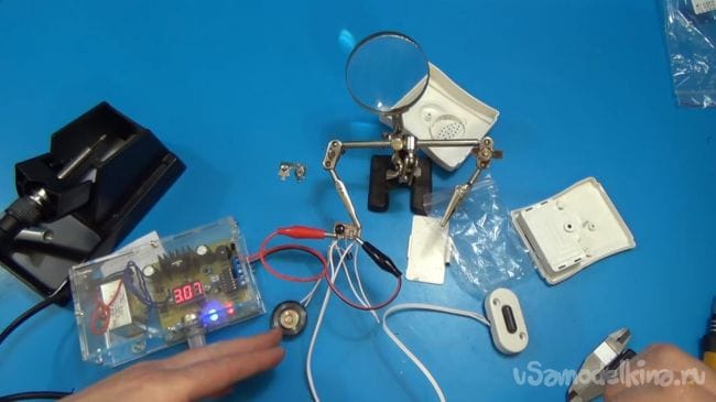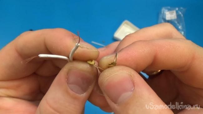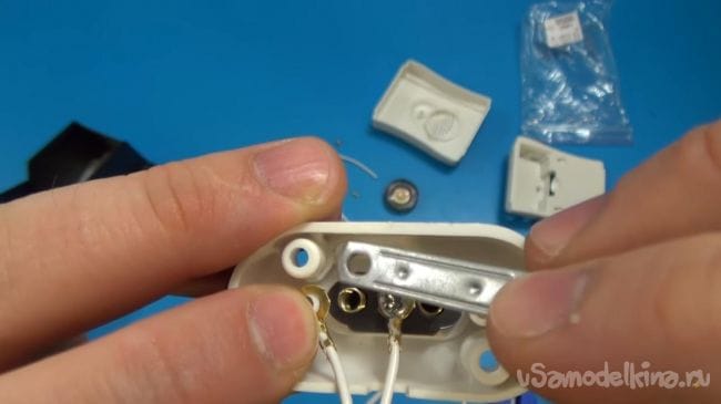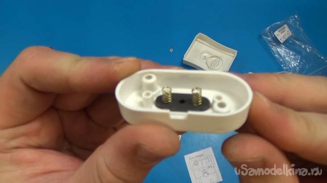 Но для начала собираем кнопку звонка, вставляем две пружинки и припаиваем к двум обжимным кольцам провод, который шел в комплекте, при желании можно применить провод подлиннее.