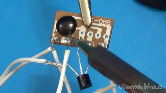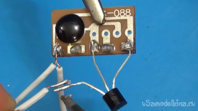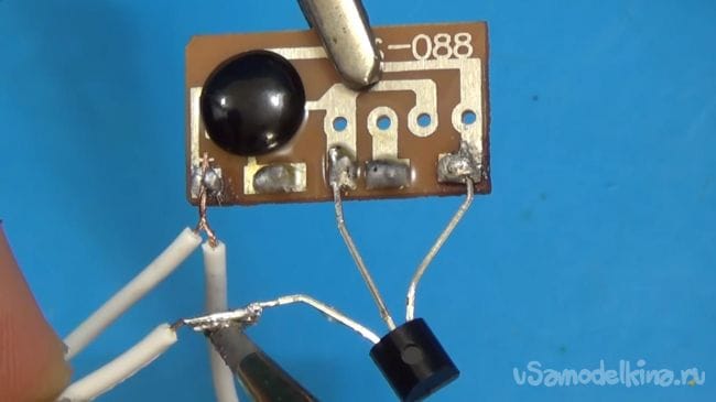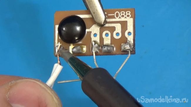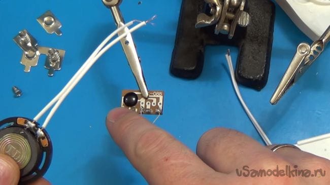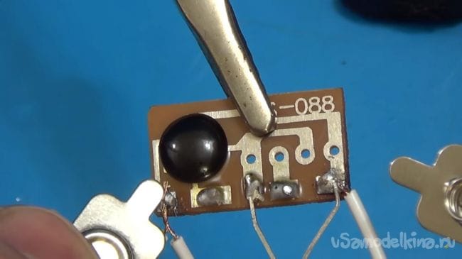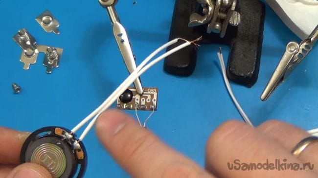 Припаиваем провода, которые шли в комплекте к динамику, так как один из них будет припаиваться к плюсовому контакту, то вместе с этим проводом сматываем еще один для питания, после чего наносим флюс и припаиваем к плате, второй контакт динамика соединяем пайкой с свободным выводом транзистора.