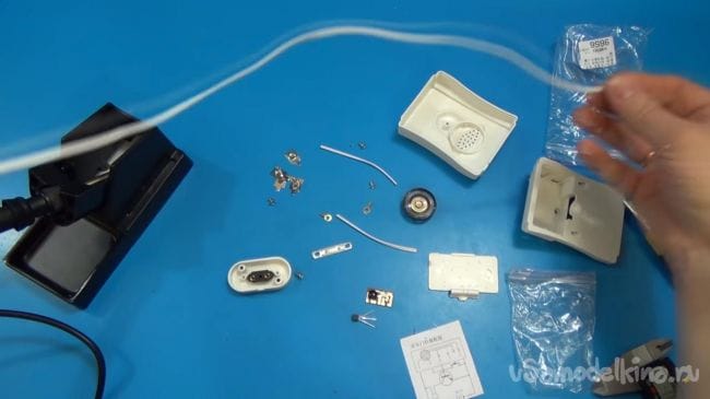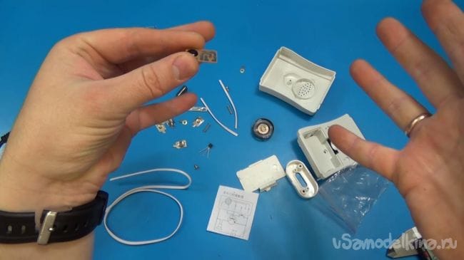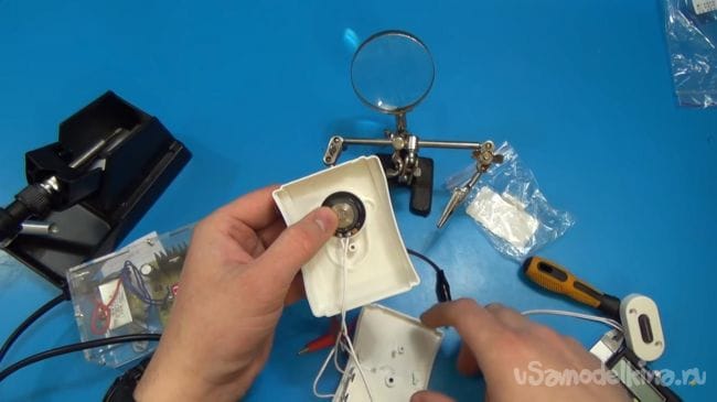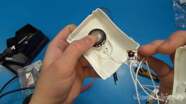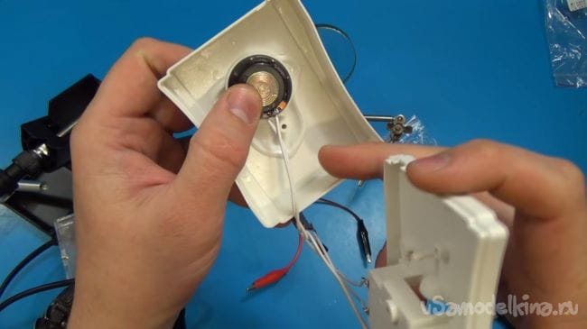 Сборка компонентов в корпус является самым простым этапом, самое главное это не забыть приклеить динамик в его посадочном месте, чтобы он при тряске или падении не выпал, а также закрепить плату в корпусе, сделать это можно также при помощи горячего клея, используя клеевой пистолет.