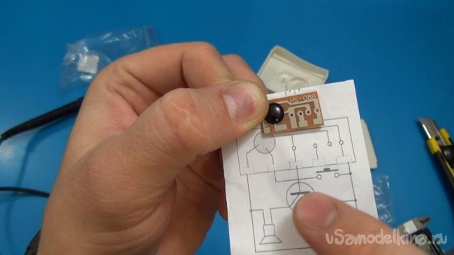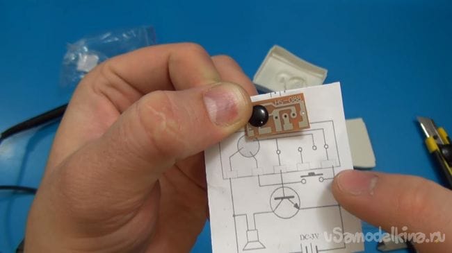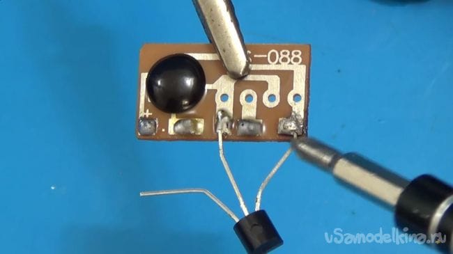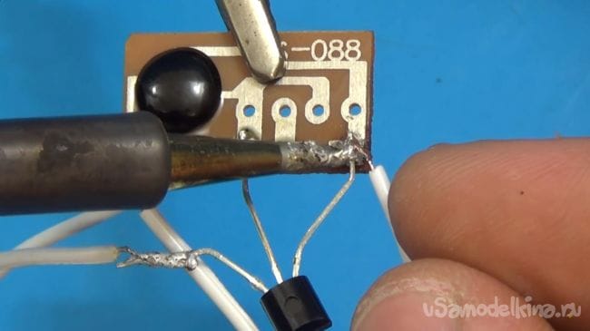 Провода, идущие от кнопки припаиваем к предпоследнему контакту слева на плате и второй провод на минус или же эмиттер транзистора, без разницы.