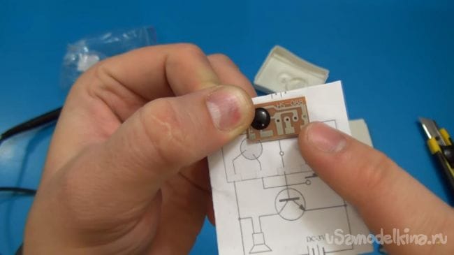 Теперь время припаять транзистор, он имеет маркировку S9013 и если разместить транзистор полукруглой частью наверх, то припаивать его следует так, самая первая ножка (эмиттер) припаивается к самому крайнему правому контакту платы, средняя ножка (база) к контакту на середине платы, а крайний левый контакт транзистора( коллектор) припаивается к выходу на динамик.