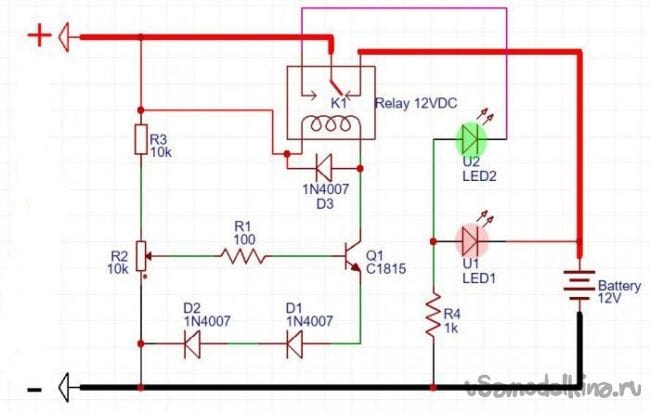 Автоматику для зарядного устройства собрал по схеме ниже. Все компоненты не дорогие и доступные.