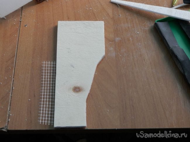 Шаг 6 навешивание руля. Я вырезал руль, наклеил его с двух сторон на сетку серпянку, к стойке приклеил мотораму и усилил уголками по бокам