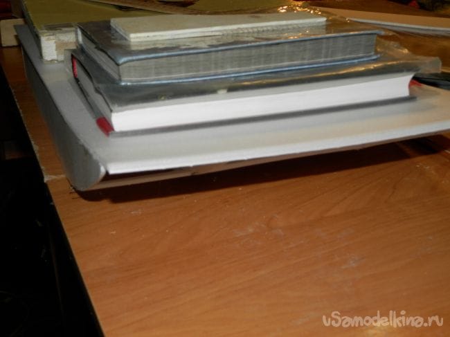 Шаг 3 усиление каркаса и его обшивка. подробно описывать усиление не буду все понятно на фото. Далее я начал обшивать каркас. Сначала приклеил верхнюю часть обшивки и положил книги.