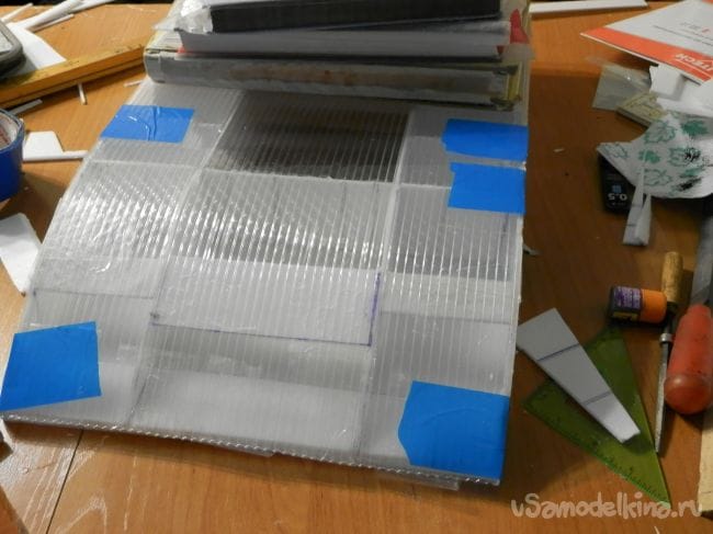 Шаг 5 приклейка нижней обшивки. На следующий день я зашкурил все детали и края обшивки. Вырезал поликарбонат для теплиц. Начал его клеить : намазал клеем, спереди закрепил скотчем и загнул, сверху положил книги