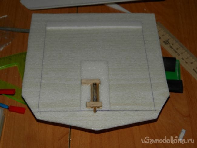 Шаг 8 изготовление крышки. Я вырезал крышку из одного слоя пенопласта и вклеил шпингалету, собранную заранее.