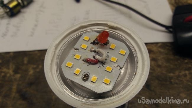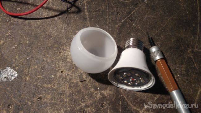 Такой светодиод уже гораздо проще впаять в плату при помощи обычного паяльника, который наверняка имеется у многих. После сборки лампы в исходное состояние и подключении её в сеть свечение её ничем не отличается от первоначального.