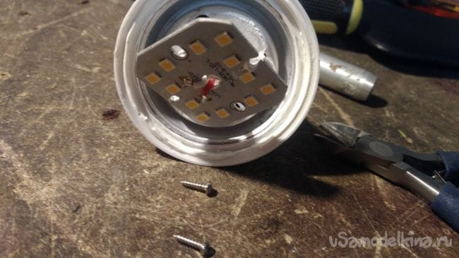 Рассмотрим случай когда неисправна плата СИД. Диоды расположенные на плате, включены между собой последовательно, и поэтому достаточно одному из них выйти из строя, как вся цепь диодов перестаёт работать. Осталось только обнаружить неисправный светодиод и заменить его.
