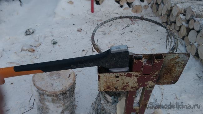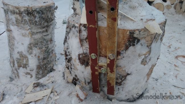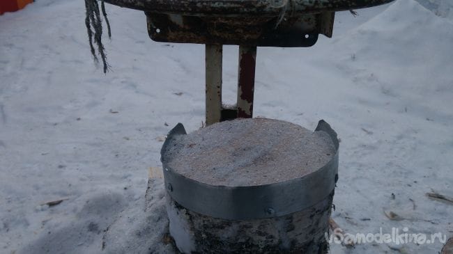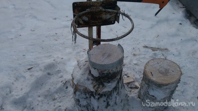 Для того что бы расколотые поленья не соскальзывали с чурбака, по окружности закреплена полоска жести.