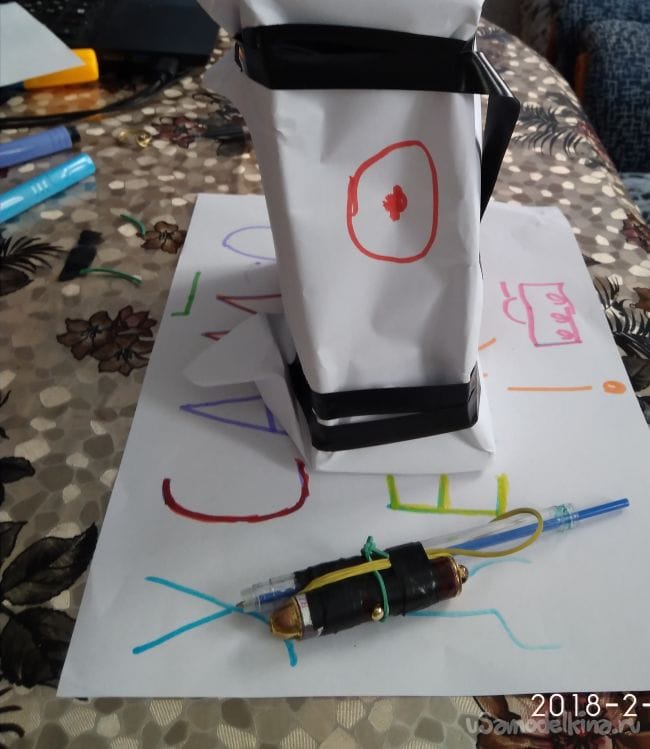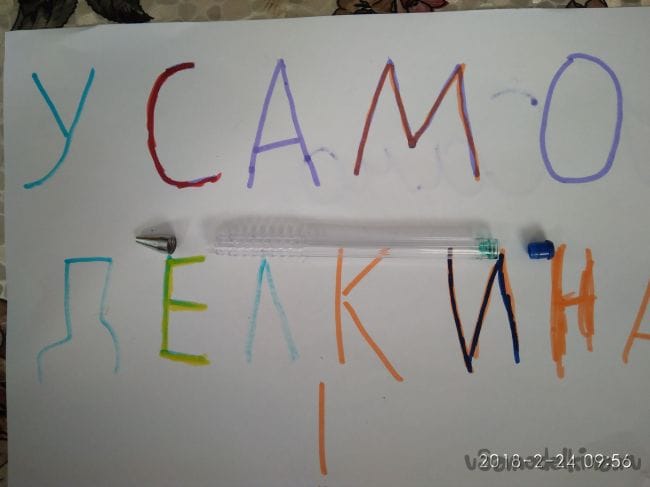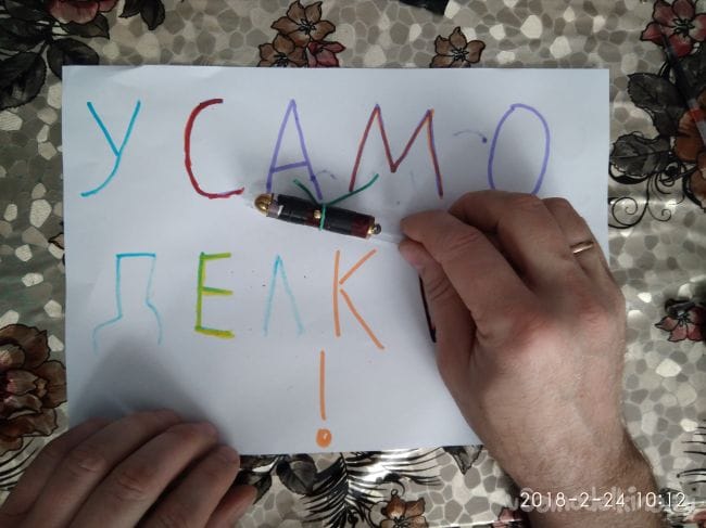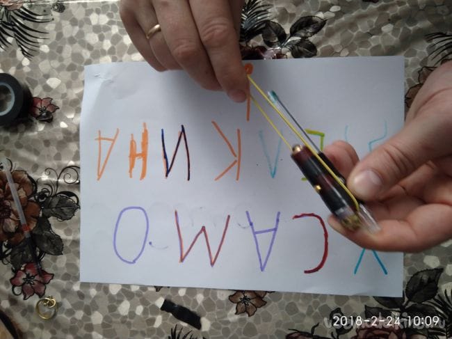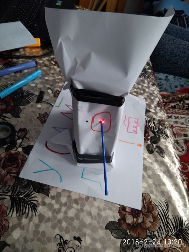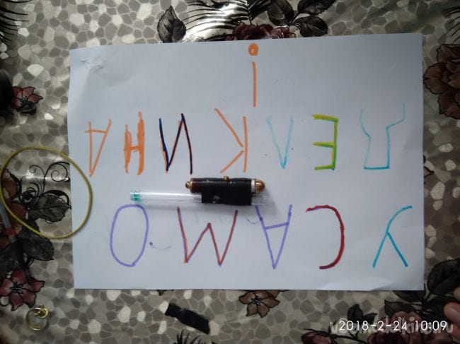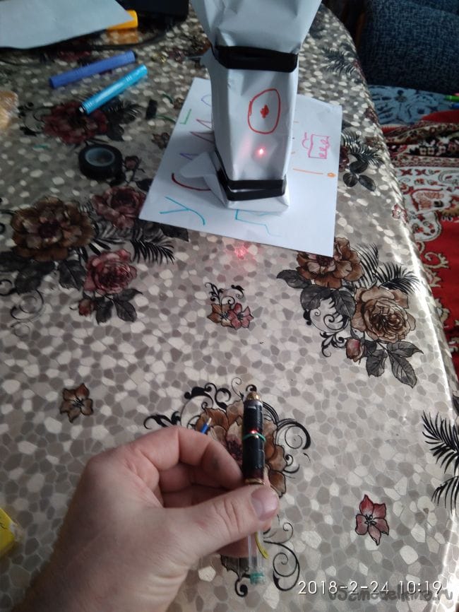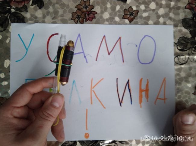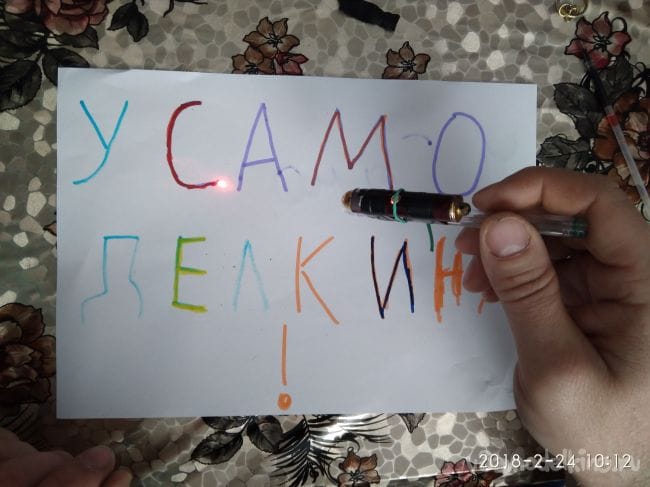 Как видите моя супермощная стреляющая ручка с лазерным прицелом пробивает бумагу и бьет точно в цель.