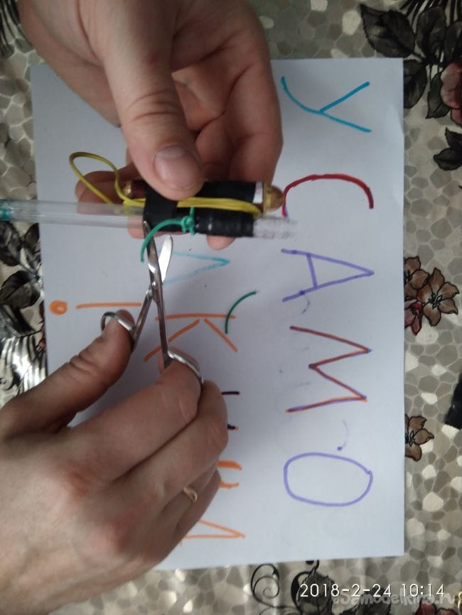 К сожалению маленькая резинка у меня порвалась, все таки я не настоящий самодельщик, я только учусь, поэтому пришлось её связывать. Эта резинка фиксирует кнопку лазерного прицела. Обрезаю концы резинки.