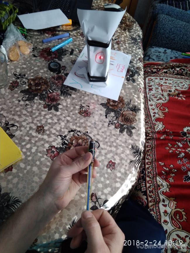 Супермощная стреляющая ручка с лазерным прицелом готова. Осталось зарядить ручку пастой и можно проводить испытания. Для испытаний я сделал мишень.