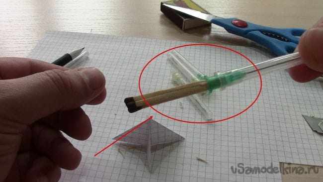 Берем 4 спички и с помощью ножа немножко подгоняем их что-бы загнать в иголку.