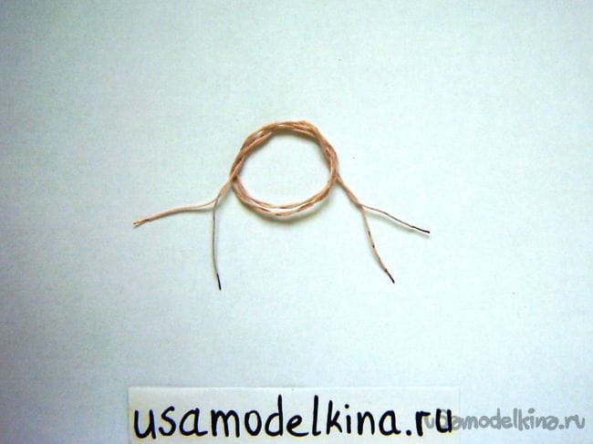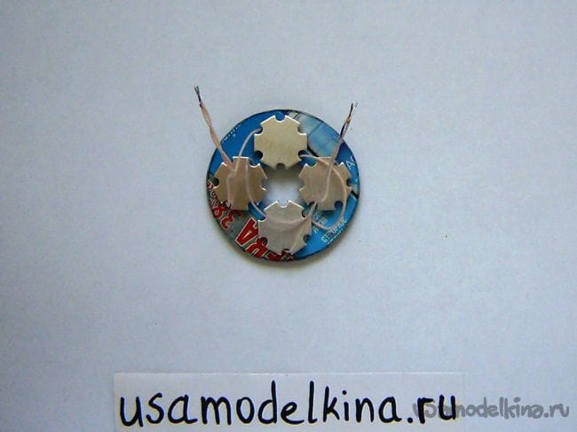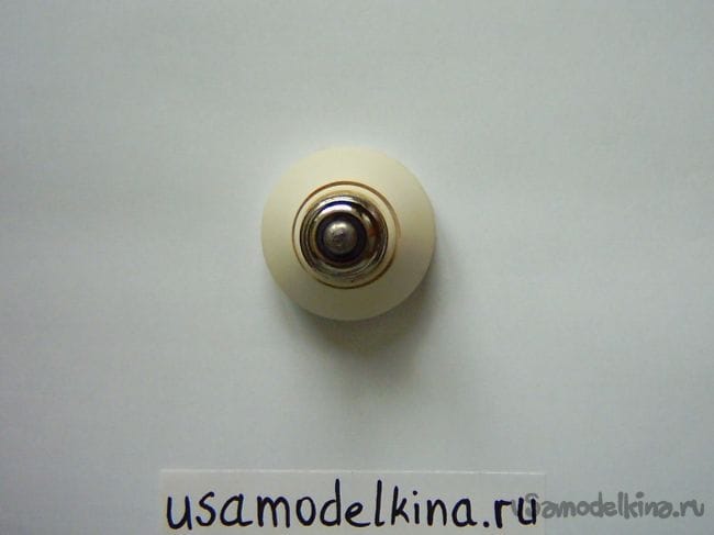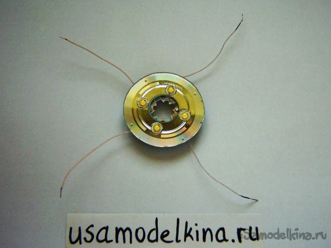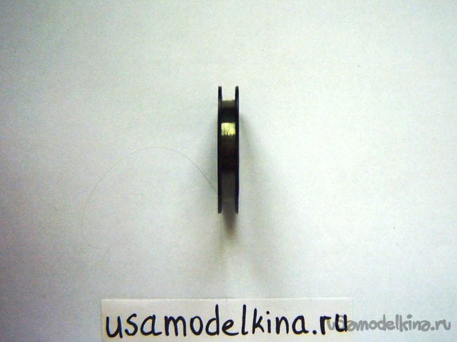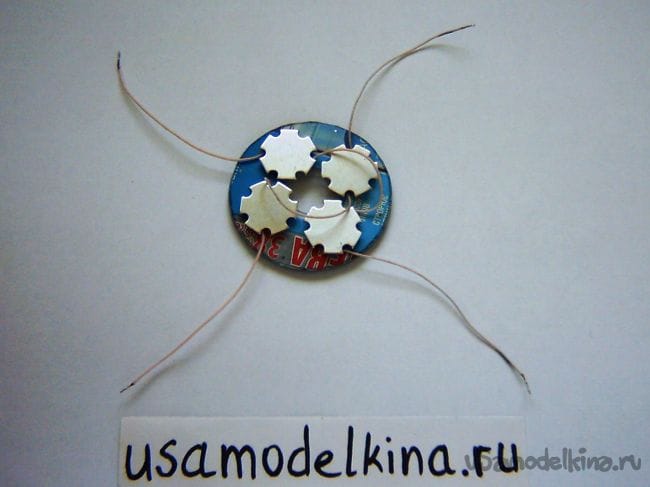 Для соединения малого диска с цоколем на стороне стакана цоколя сверлим 4 симметричные отверстия диаметром 0,8 мм и завязываем леской. Чтобы леска не выступала с цоколя, оставляем длинные ее конце (30 мм) и затягиваем внутрь: