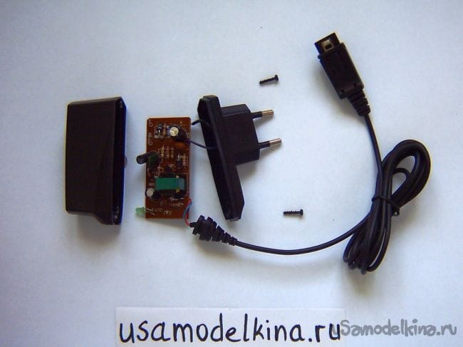 Разбираем мобильную зарядку, если она не входит в стакан цоколя, то ее можно немного отрезать, забрав, например, зеленый индикаторный светодиод. И припаиваем контакты белых светодиодов:
