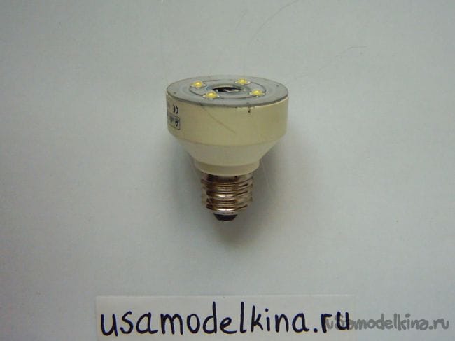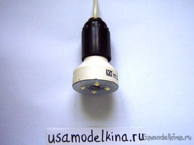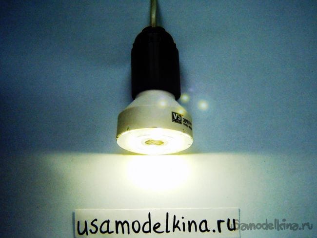 Лампа готова для проверки работы, вкручиваем ее в патрон и включаем 220 в: