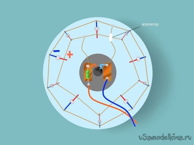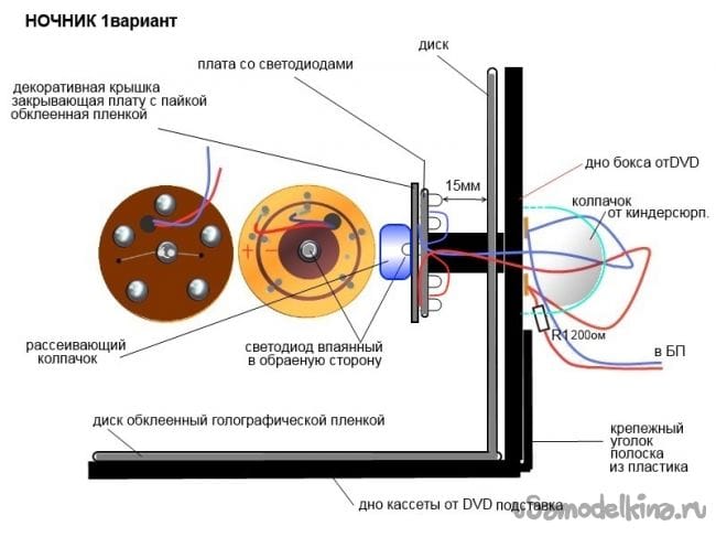 вырезаем плату(диам.40мм), цыркулем размечаем токоведущие дорожки и положение светодиодов, сверлим отверстия для диодов и выводов провода и паяем соблюдая полярность (см.рис.). Наружный диод (можно "таблетку" более яркий с рассеиванием) переворачиваем и закрепляем клеем в центре платы, выводы его выводим через отверстия и припаиваем. У двух концов проволоки ПЭЛ 05мм длинной 100мм зачищаем от изоляционного лака концы, впаиваем и помечаем полярность одного из проводов капелькой термоклея. Аккуратно скручиваем и пропехиваем через обрезанный носик бокса. С обратной стороны бокса приклеиваем кусочки фольгированного текстолита к ним припаиваем вывода от светильника, резистор 200ом и концы от блока питания. Включаем и проверяем работоспособность. Если все правильно диоды загорят. Далее приклеивам плату к носику бокса(расстояние от диска до св.диодов 15мм).