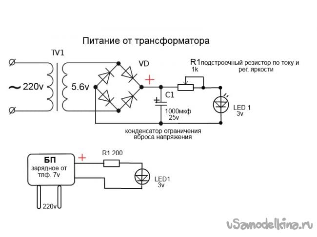 5. Светодиоды на 3v, резистор на 200 ом. для гашения по току. Медная проволока от трансформатора 05мм для соединения центрального светодиода и выводов на заднюю стенку бокса.