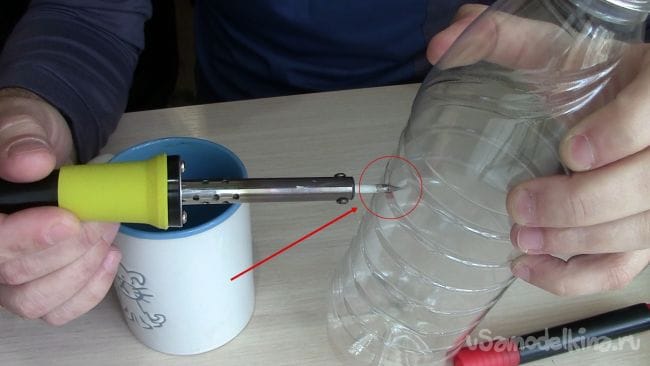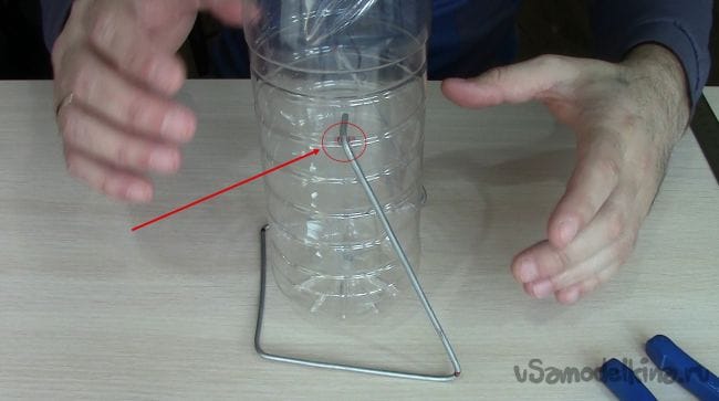 Проделываем 2 отверстия в бутылке друг напротив друга диаметром достаточным для прохождения проволоки в месте где равновесие бутылки чуть больше на стороне горлышка.