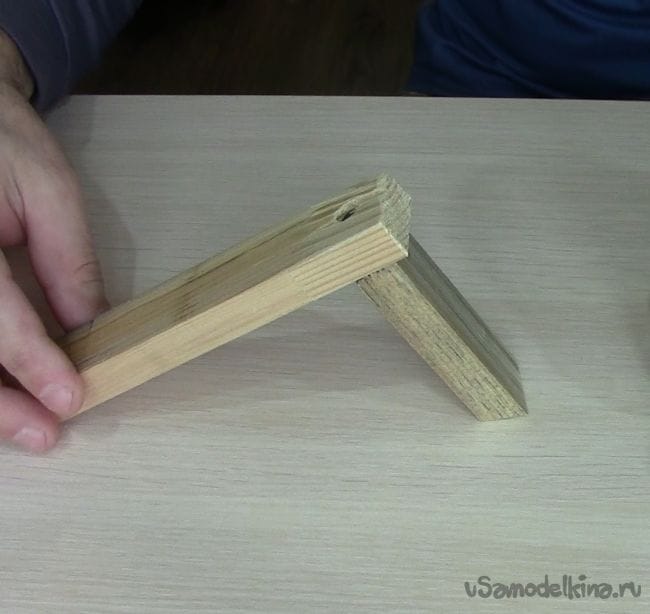 Отрезаем кусок рейки длинной примерно 9-11см и скручиваем буквой "г" две рейки саморезом. Можно сделать "подтай" под саморез, углы можно тоже подрезать что-бы подиум стоял на поверхности устойчивее.