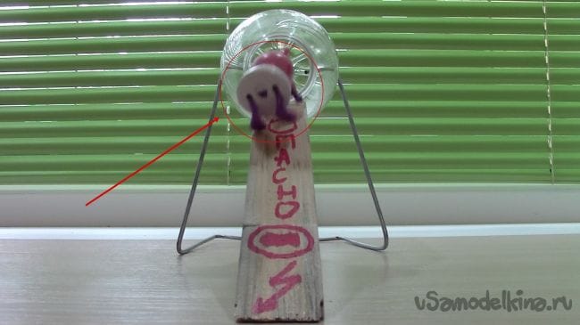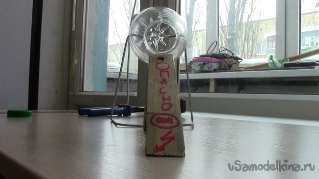 Выгибаем из проволоки конструкцию (как показано на картинке) что-бы бутылка могла свободно крутится в центре конструкции и не цепляться (по крайней мере дном) об поверхность на которой стоит конструкция.