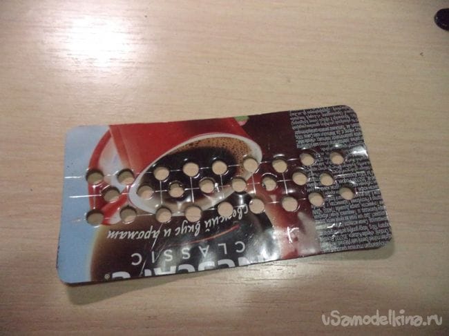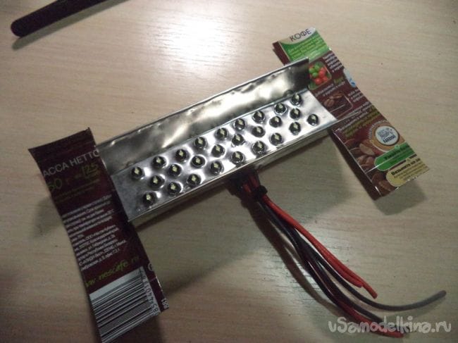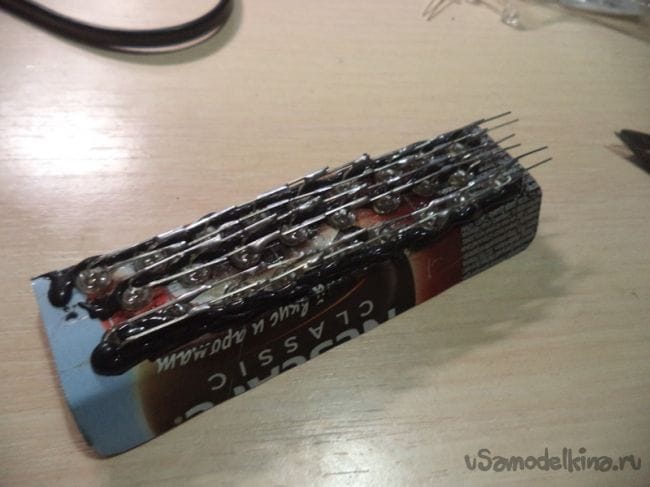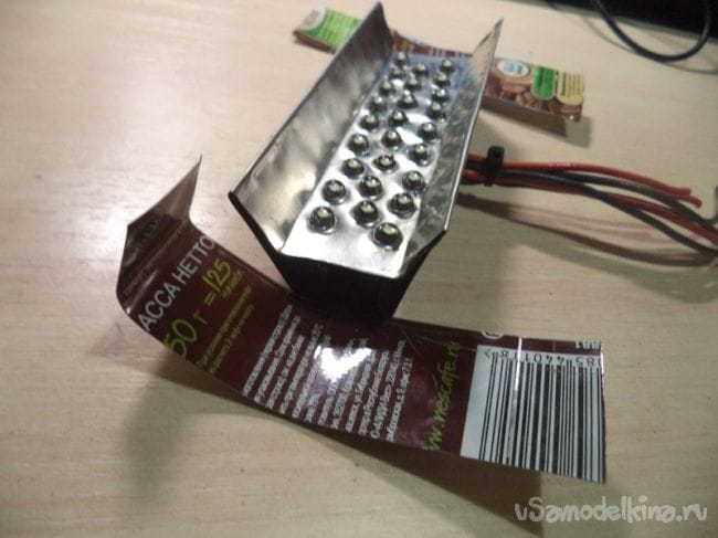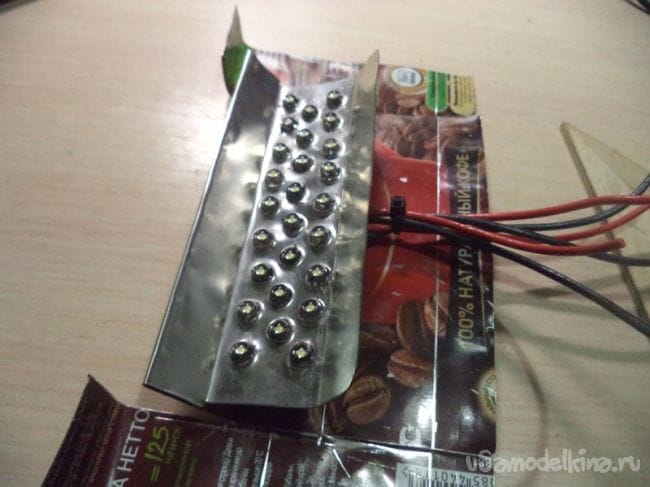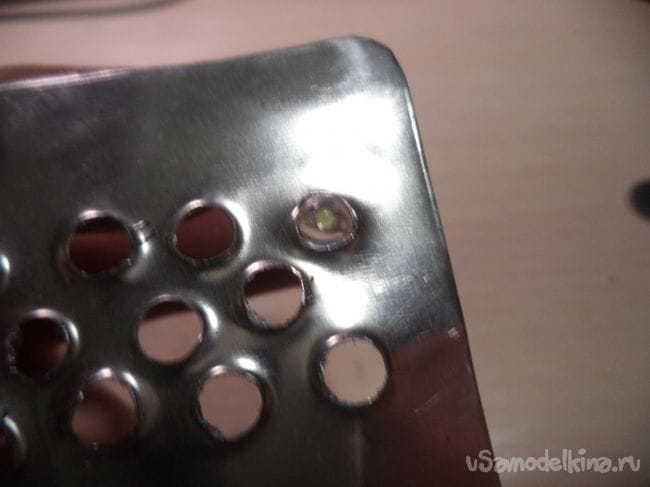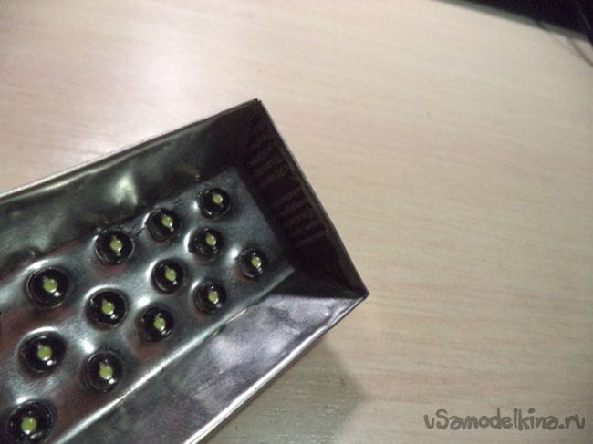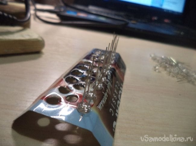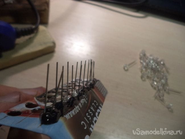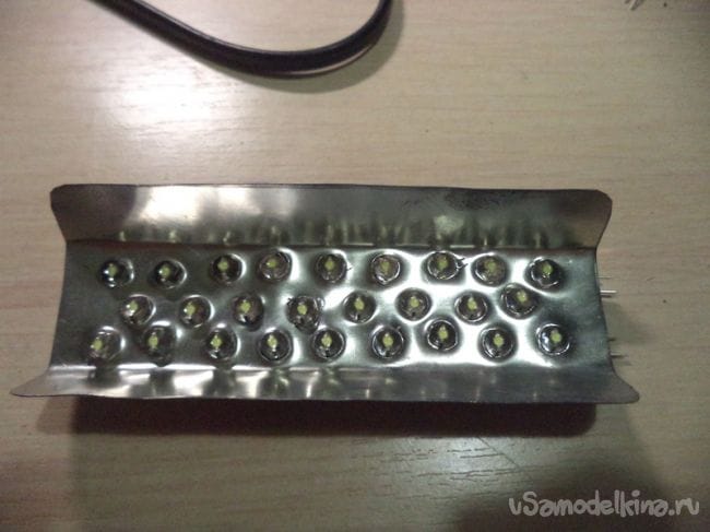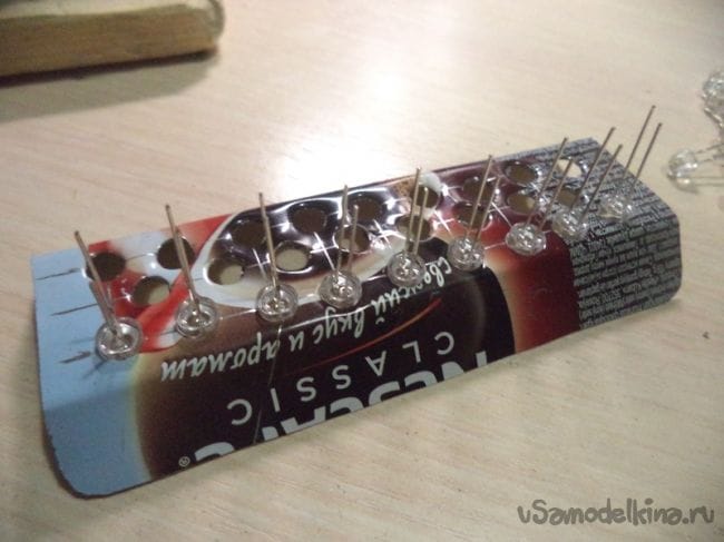 Теперь берем светодиоды и вставляем их в раннее просверленные отверстия на жестяной пластинке. Надо, чтобы минус светодиодов был с одной стороны, а плюс светодиодов был с другой стороны, чтобы их потом было легче спаять между собой параллельно.