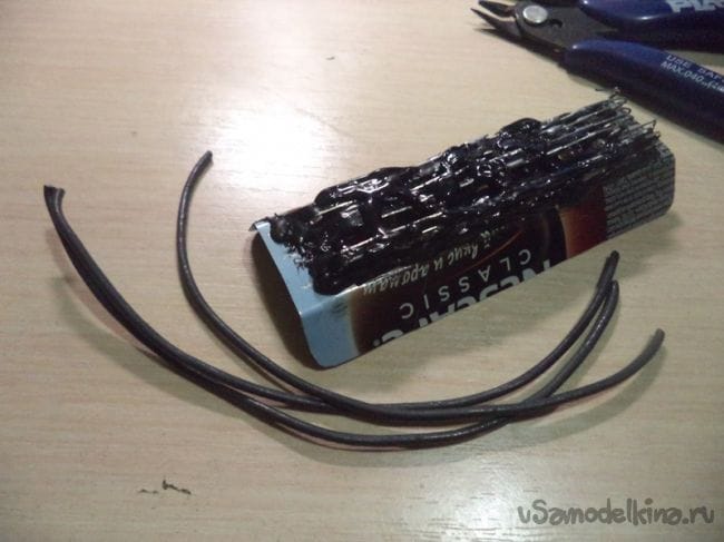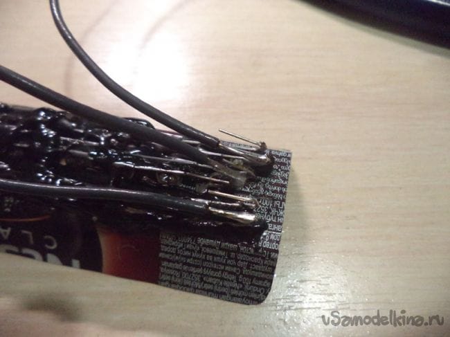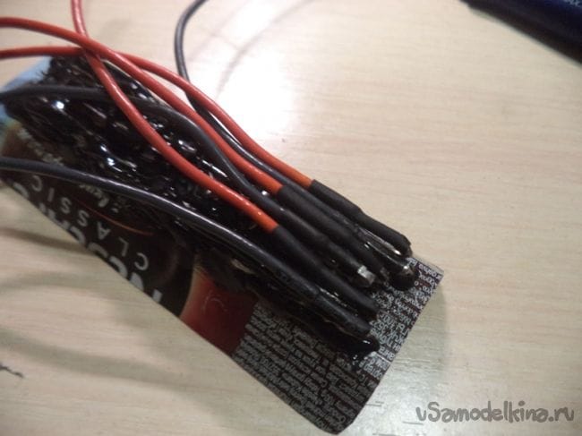 Но перед тем, как закрыть контакты, припаяем к светодиодам провода.
