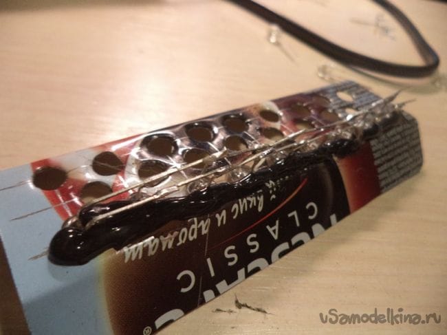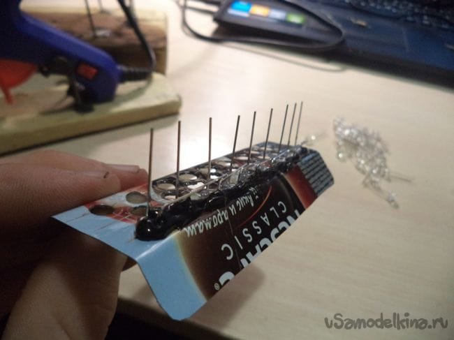 Прикрепляем светодиоды к пластинке с помощью горячего клея.