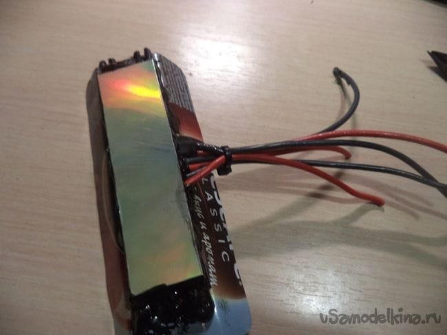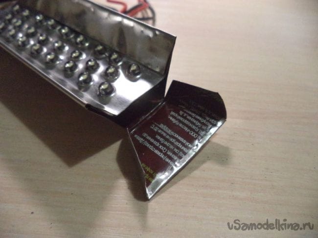 Теперь закрываем контакты светодиодов прямоугольной пластинкой из под CD диска.