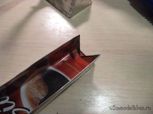 С помощью ножниц вырезаем прямоугольную часть из жестяной банки.