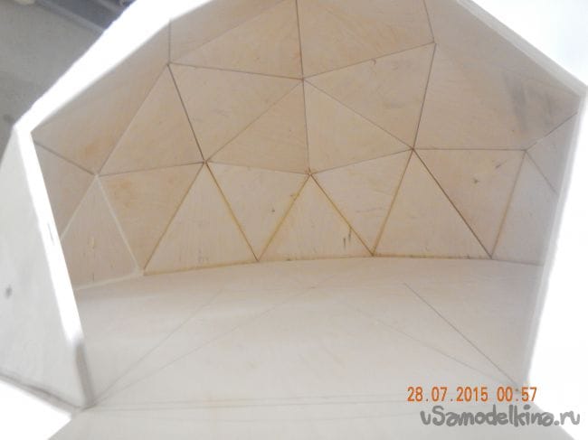 Скажу Вам - забота о своих питомцах - дело приятное, когда есть немного свободного времени. Задумал я как-то сделать конуру для собачки. Остановился на форме домика в виде геодезического купола. Планировал отделать крашенным белым цветом алюминиевым листом, приделать ножки из медных труб по периметру. Должно было получиться подобие летающей тарелки. Отделывал я маленькими кусочками с нахлестом в виде металлочерепицы (для защиты от атмосферных осадков). Но дело это кропотливое, на поверхность меньше чем наполовину, у меня ушёл месяц (в свободные вечера и не каждый день). В один прекрасный вечер, мелкий провёл своими ручками снизу вверх, и, вся моя работа пропала(. Пришлось всё снять - выровнять на месте, или использовать повторно не имело смысла. А остатка листа уже не хватает. Да и нужно было придумать что-то понадёжнее. Остановил свой выбор на мягкой кровле, закупил материал. Но я такой человек, когда не могу чётко представить конечного результата, "блуждать в темноте" не могу. Да и некогда им сейчас заниматься(.