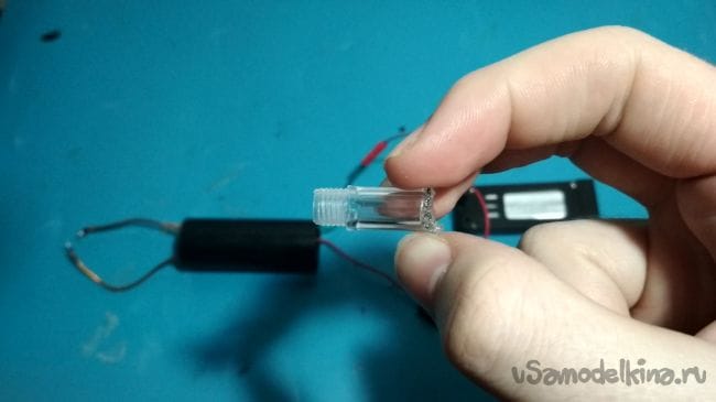 Теперь нужно сделать подгонку контактов: пробным путем регулируем расстояние между проводами внутри трубочки, нужно установить максимальное расстояние, но так чтобы разряд всё равно происходил, после нахождения этого расстояния фиксируем провода с помощью термо клея, но так чтобы внутрь трубочки мог проходить воздух, это важно, опыты показали если там будет гермитизация, то после нескольких разрядов они перестают происходить, скорее всего это из-за взаимодействия тока с электрическим полем.
