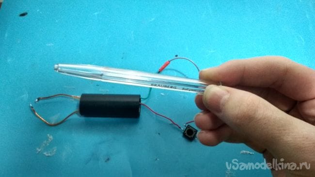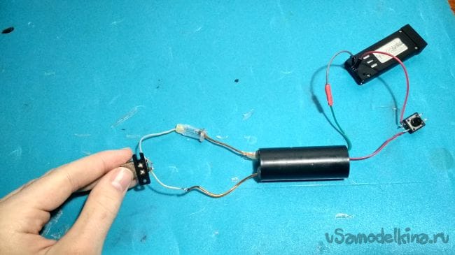 Теперь возьмём высоковольтный преобразователь и припаяем к одному из его входному поводу кнопку, к этой кнопки припаиваем провод типа "папа", а к другому входному проводу также припаиваем провод типа "папа"