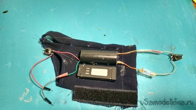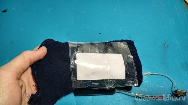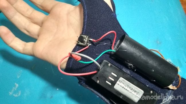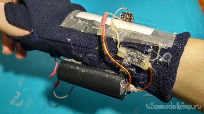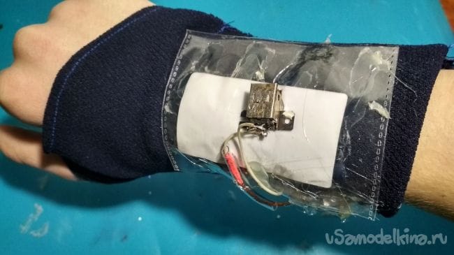 Должно получиться что-то вроде этого, для крепления самого устройства и удобного расположения под кнопку включения (на перчатке-браслете следы термо клея от прошлых самоделок):