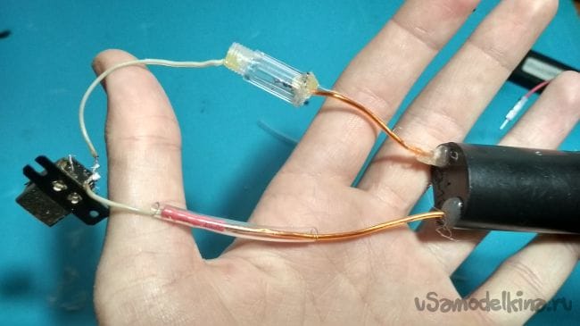Вставляем один из выходных проводов высоковольтника в нашу заготовку, но не глубоко, провод должен уходить внутрь не глубже чем 5 мм, затем фиксируем все с помощью термо клея:
