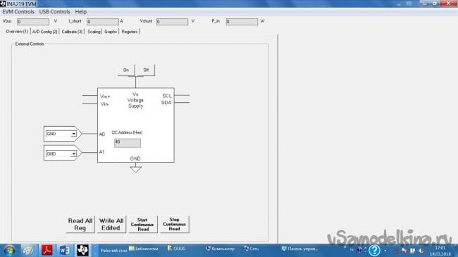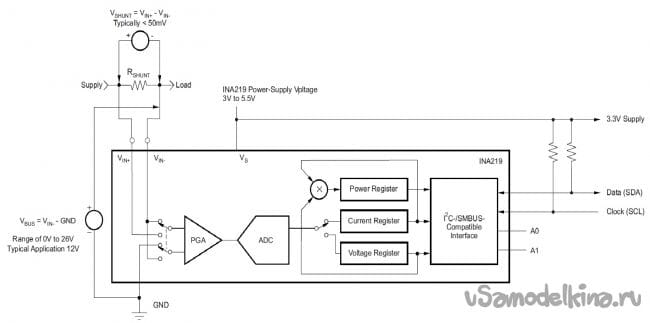 Основным элементом на плате является микросхема INA219. Микросхема INA219, несмотря на маленький размер и малое количество выводов, обладает большими возможностями. Микросхема измеряет напряжение на шунте (на выводах Vin+ и Vin_) – резисторе с малым сопротивлением и на контакте Vin- относительно контакта GND поочерёдно. Результаты вычислений записываются в регистры, затем по шине связи I2C передаются на микроконтроллер. На плате установлен шунт с сопротивлением 0,1 Ом. Напряжение в микросхеме измеряет аналогово - цифровой преобразователь АЦП. АЦП может работать в 9-ти, 10-ти, 11-ти, 12-тибитных режимах. Настраивается режим работы микросхемы изменением регистра конфигурации. У производителя есть бесплатная программа INA219 EVM для настройки конфигурации микросхемы INA219. Файл программы - sboc271.zip