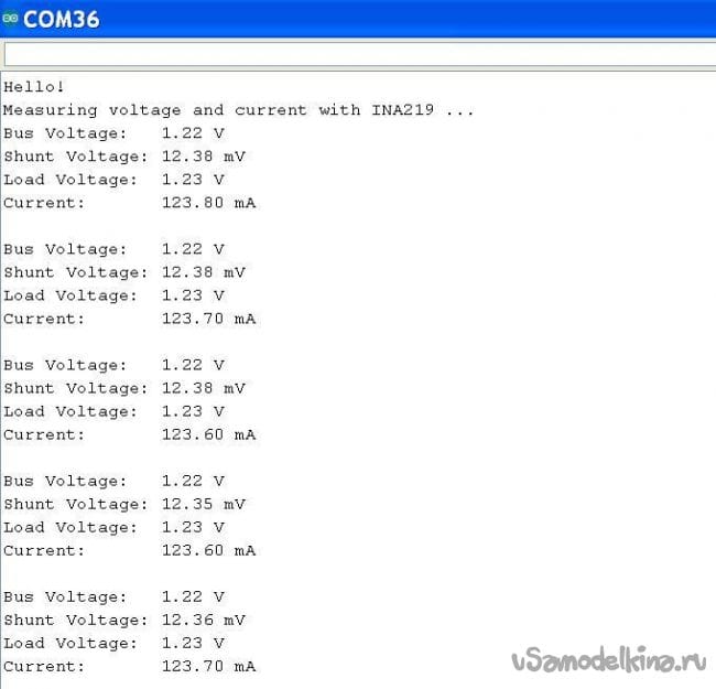 Выполняем компиляцию примера getcurrent. Загружаем данные в контроллер платы Arduino UNO. Открываем в программе Arduino UNO монитор последовательного порта и видим результат измерения, получаемый от микросхемы INA219.