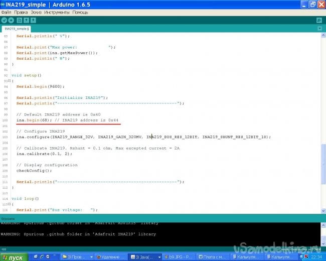 Для того, чтобы код скомпилированный (преобразованный в вид пригодный для записи в микроконтроллер платы Arduino UNO) смог работать с платой на микросхеме INA219 c адресом 0х44, надо изменить в примере строку ina.begin(); на строку ina.begin(68);