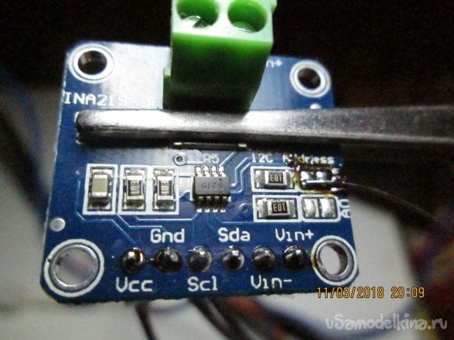 Для изменения адреса шины I2C платы с микросхемы INA219 я запаял перемычку и определил новый адрес шины I2C.