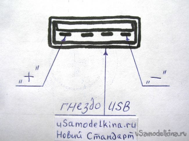 В подавляющем большинстве гаджетов для зарядки используют разъем USB, имеющих на 1 и 4 выводах напряжение от 5 до 7 в (рекомендуется 5,5 в). Здесь важно правильно подключить плюс и минус питания, и не путать цоколь штекера с гнездом!