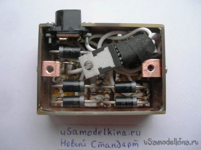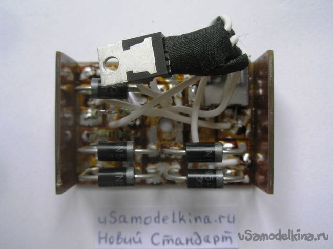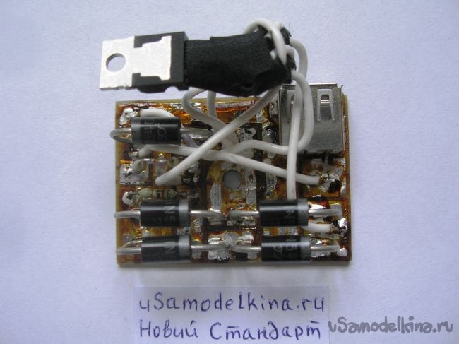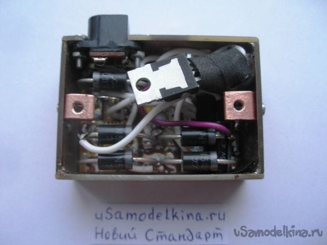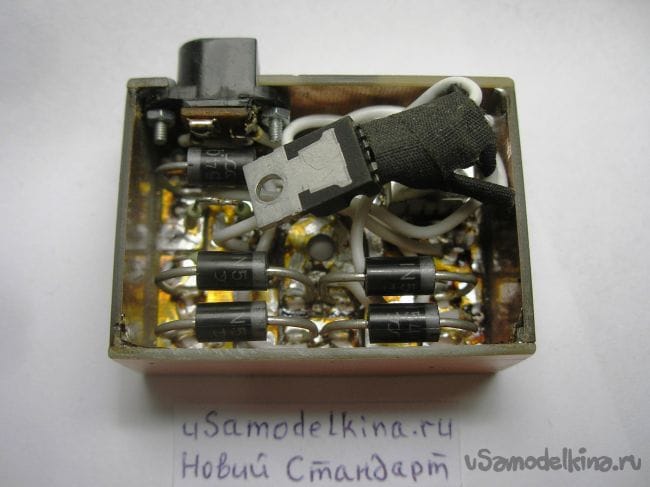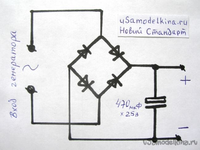 Так как на выходе в велосипедного генератора переменное напряжение, то для получения постоянного на входе зарядки ставлю диодный мост и электролит.