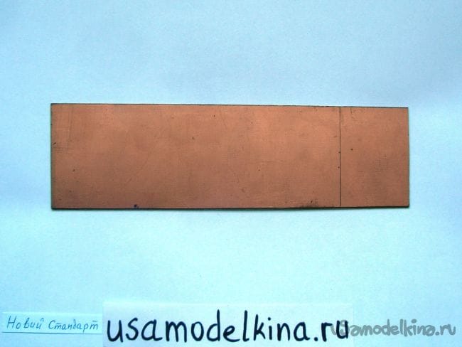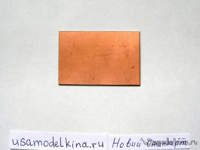 Этап 1. Ножовкой вырезаем из фольгированного текстолита прямоугольник размером 50х35мм, и хорошо выравниваем стороны надфилем: