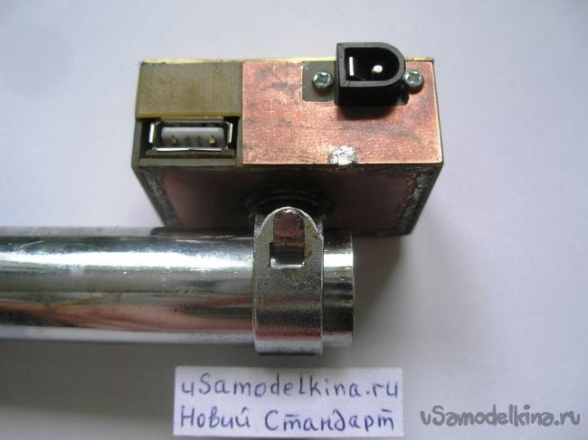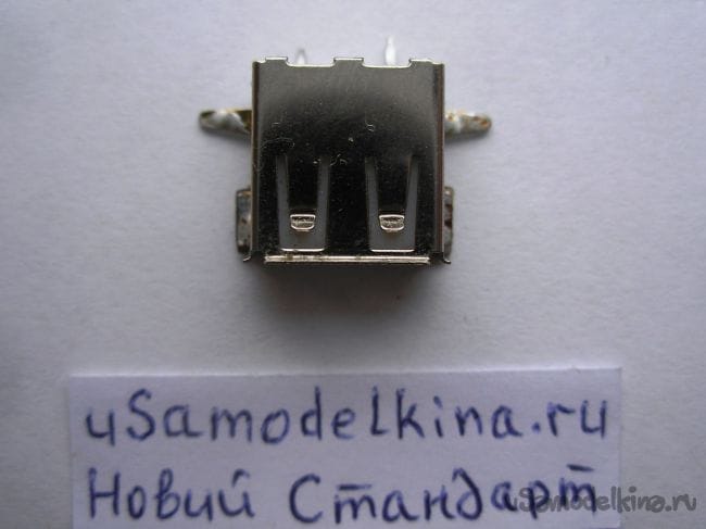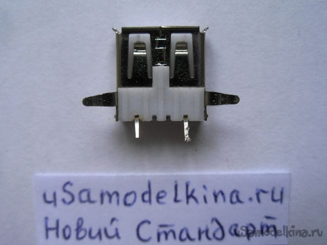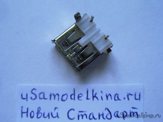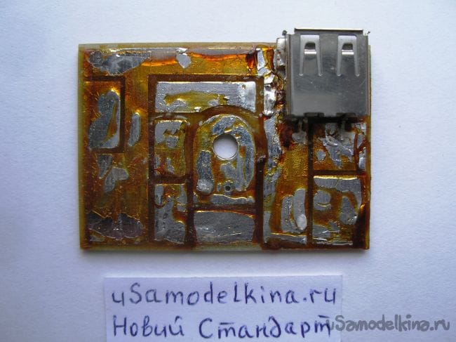Этап 5. Подготавливает гнездо-USB, припаяв к нему кусок текстолита. В гнезде-USB используется только два контакта, номер 1, 4 и корпус, другие не используются, поэтому удаляются. Устанавливаем гнездо на плату: