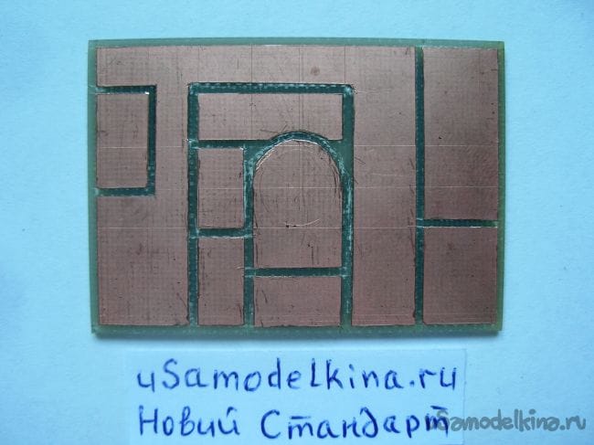 Этап 2. С помощью канцелярского ножа вырезаем токопроводящие дорожки с одной стороны платы: