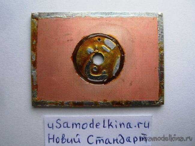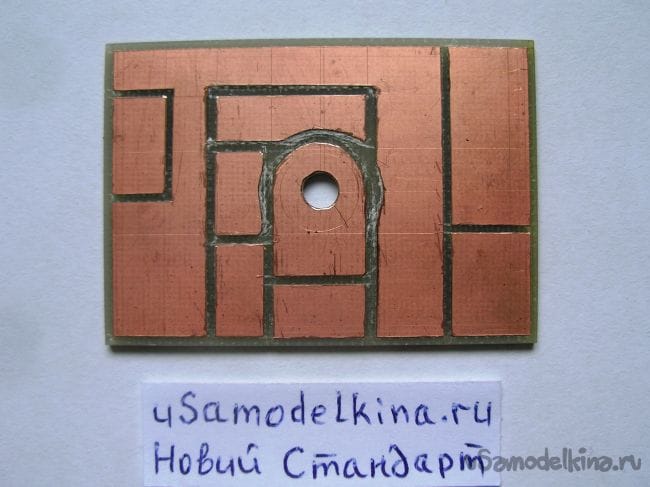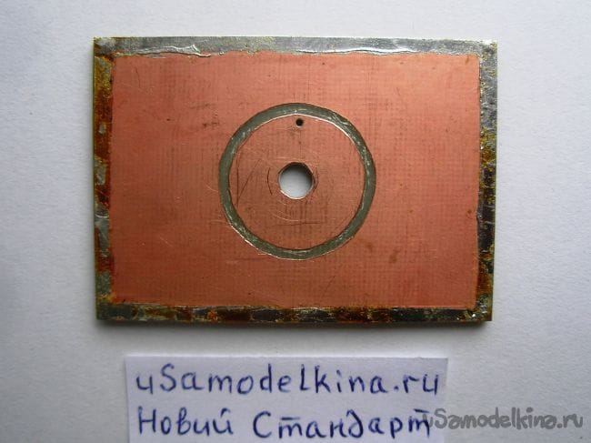 Этап 3. На обратной стороне платы вырезаем дорожку в виде круга диаметром 15 мм, ближе к периметру круга сверлим отверстие диаметром 0,8 мм (через это отверстие припаяеться перемычка между сторонами платы):