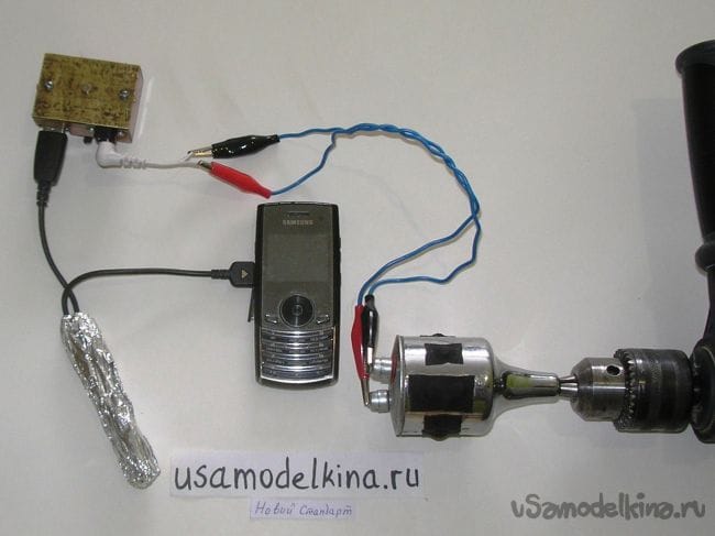 Этап 13. Проводим контрольный эксперимент по возможности зарядки с мобилкой, используя дрель, зажав в патроне вал генератора. При езде на велосипеде генератор (средняя скорость колеса 20 км/час) дает больше оборотов чем дрель (где то в 1,5-2 раза), но стабилизатор напряжения не допускает превышения напряжения.