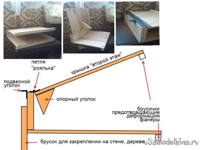 Предлагаю простую универсальную кормушку для птиц. Она рассчитана для подкормки маленьких пернатых обитателей, но если вы сильно любите и больших, например голубей, то сможете их подкармливать на втором этаже-крышке. Крышка как раз служит и барьером от ворон и голубей. За счет ее они не смогут проникать на первый этаж, где кормятся маленькие птички. Кормушку можно использовать как на стене, балконе так и на дереве. Для закрепления на перилах балкона, брусок убирается. Откидная крышка удобна для насыпания корма и чистки кормушки.
