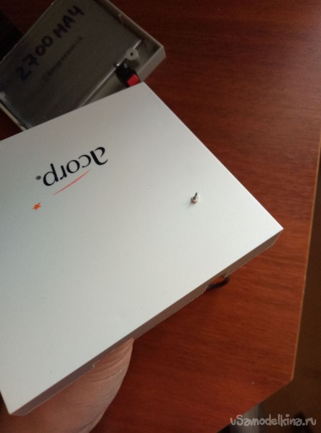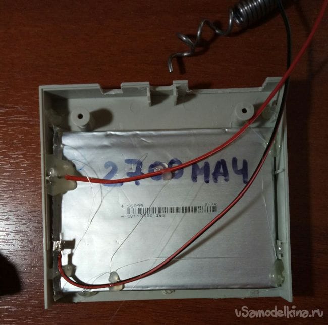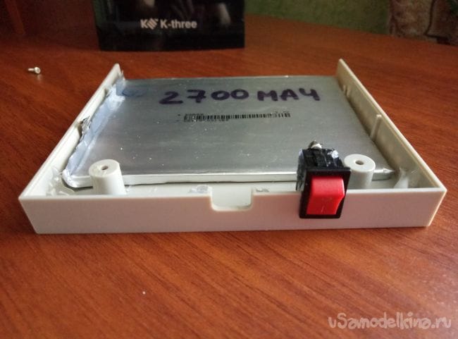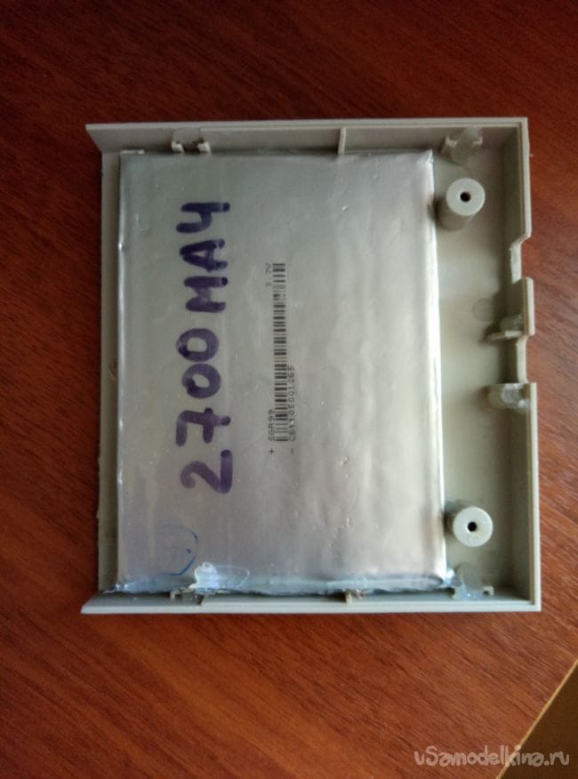 С корпусом я определился. По размерам он оказался достаточно вместителен. Внутрь с легкостью помещается 3 банки 18650 li-ion от аккумулятора старого ноутбука. Но после их заряда оказалось, что за долгое время работы в ноутбуке, ни одна из 6-ти проверенных мной банок не держала заряд (они саморазряжались). Было решено использовать другую литиевую батарею. Донором стала электронная книга. У нее не работал экран (был разбит), но я помню, что она довольно-таки долга держала заряд (порядка 8 часов включенного экрана). Заявленная производителем емкость 2700 mah. Размеры аккумулятора приличные, но в новообретенный корпус он поместился.