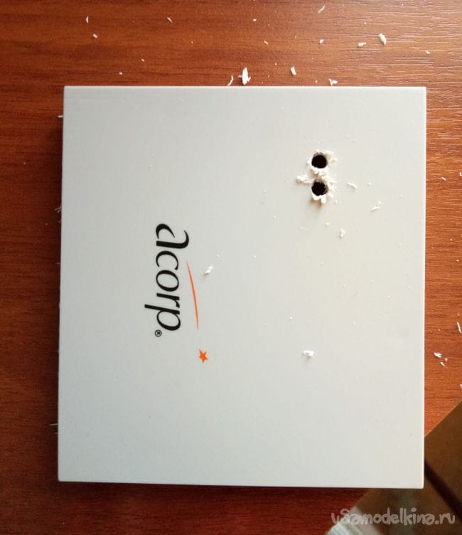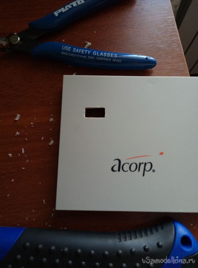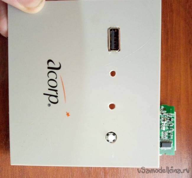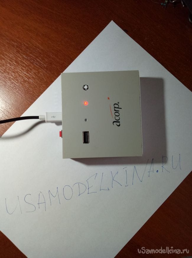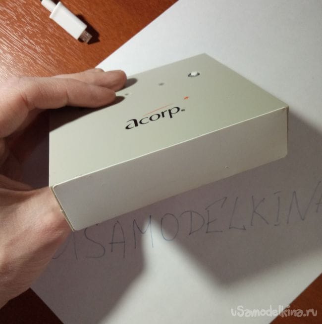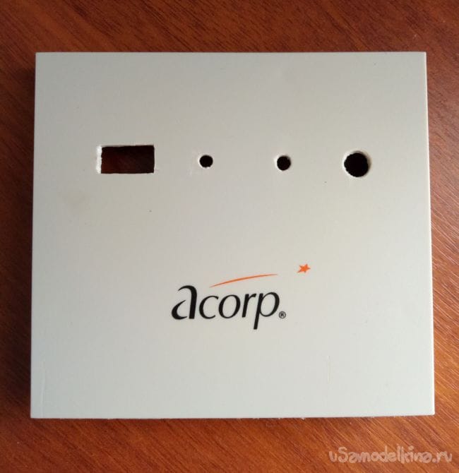 Начнем с подбора корпуса для будущей самоделки. Я перебрал множество вариантов. Думал сделать корпус не стандартный, а, например, из фанеры или дерева. Но попробовав распилить кусок фанеры в комнате, получил кучу пыли и мусора. Идея деревянного корпуса показалась мне тоже трудно осуществимой в квартирных условиях. Тогда мне на глаза попалась квадратная пластиковая коробочка без одной стенки. По-моему когда-то это был картридер ( card reader) от стационарного компьютера. На одной из сторон коробки остался логотип фирмы Acorp.